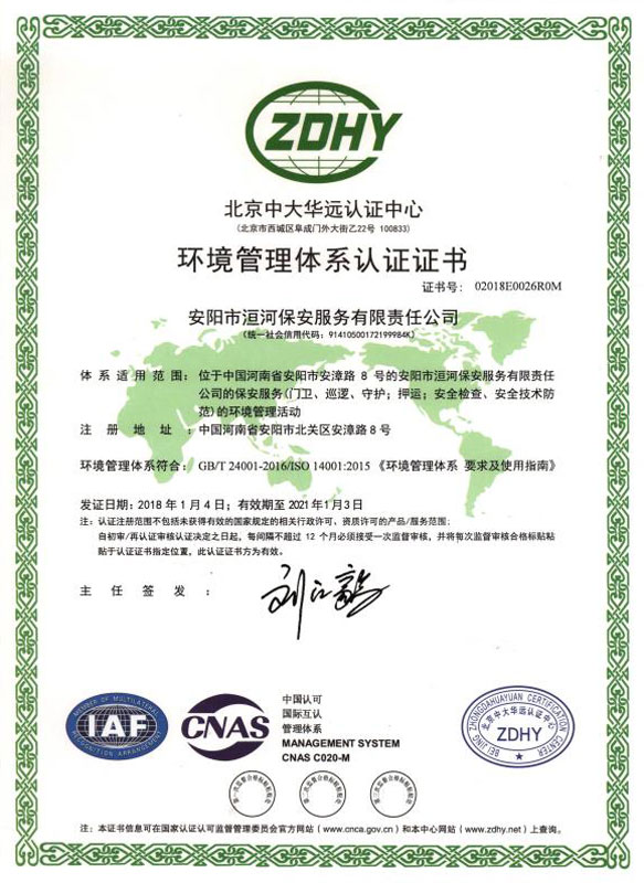環(huán)境管理體系認證證書