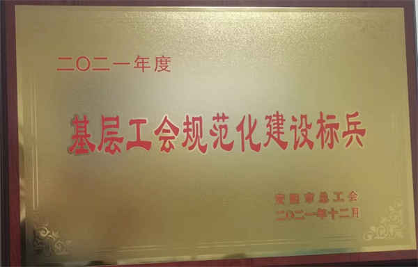 近日,公司工會(huì)被安陽市總工會(huì)授予“2021年度安陽市基層工會(huì)規(guī)范化建設(shè)標(biāo)兵”榮譽(yù)稱號(hào)。