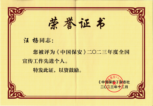 2023年12月,《中國保安》雜志對2023年度全國保安行業(yè)宣傳工作成績突出的集體和個人進行了表彰,公司綜合辦公室汪楊同志榮獲“2023年度全國宣傳工作先進個人”稱號。