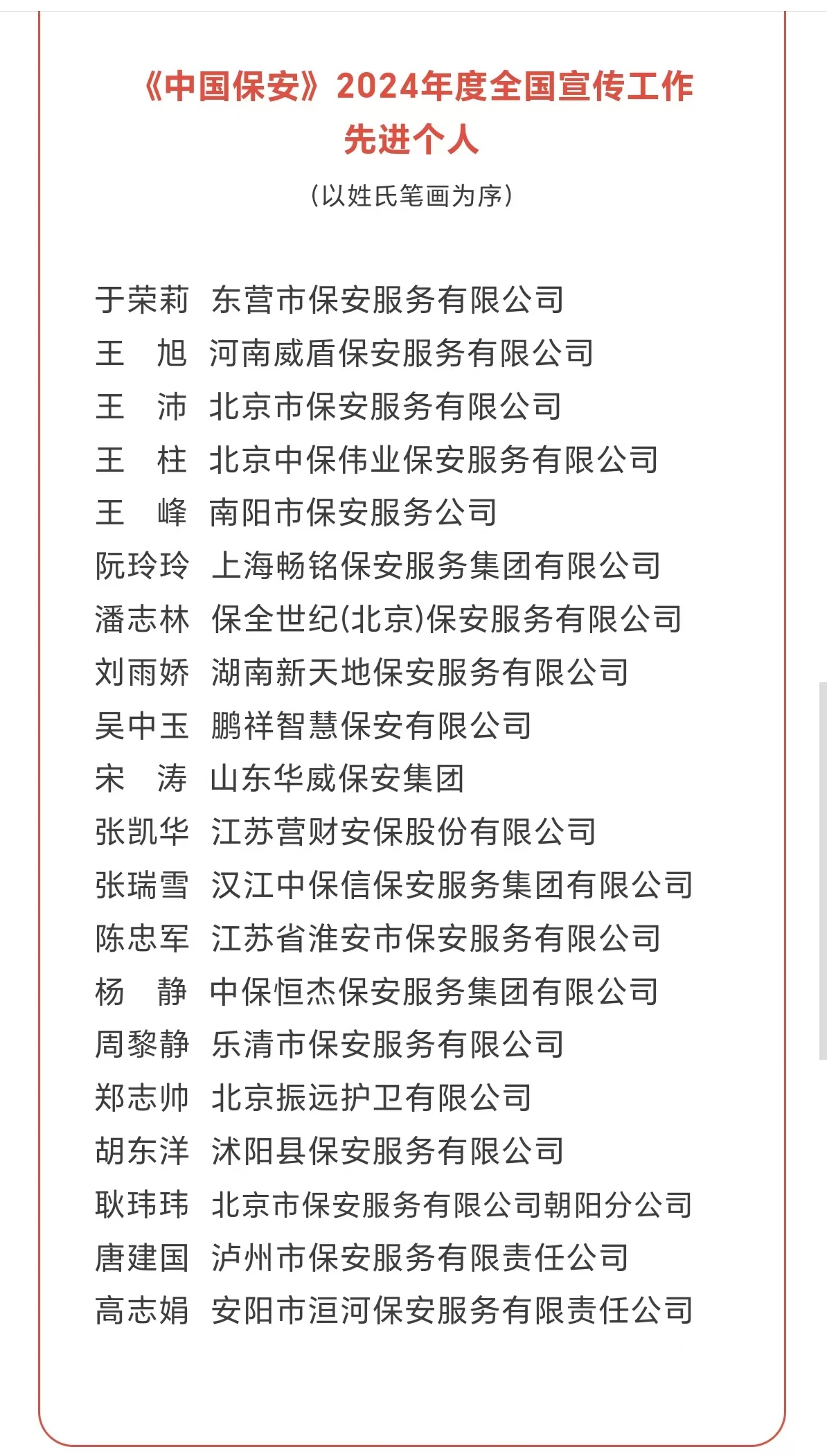 3月5日,《中國保安》雜志2024年度全國宣傳工作優(yōu)秀組織獎、優(yōu)秀撰稿人、先進(jìn)集體、先進(jìn)個人評選揭曉,公司綜合辦公室高志娟同志喜獲“全國宣傳工作先進(jìn)個人”榮譽(yù)。