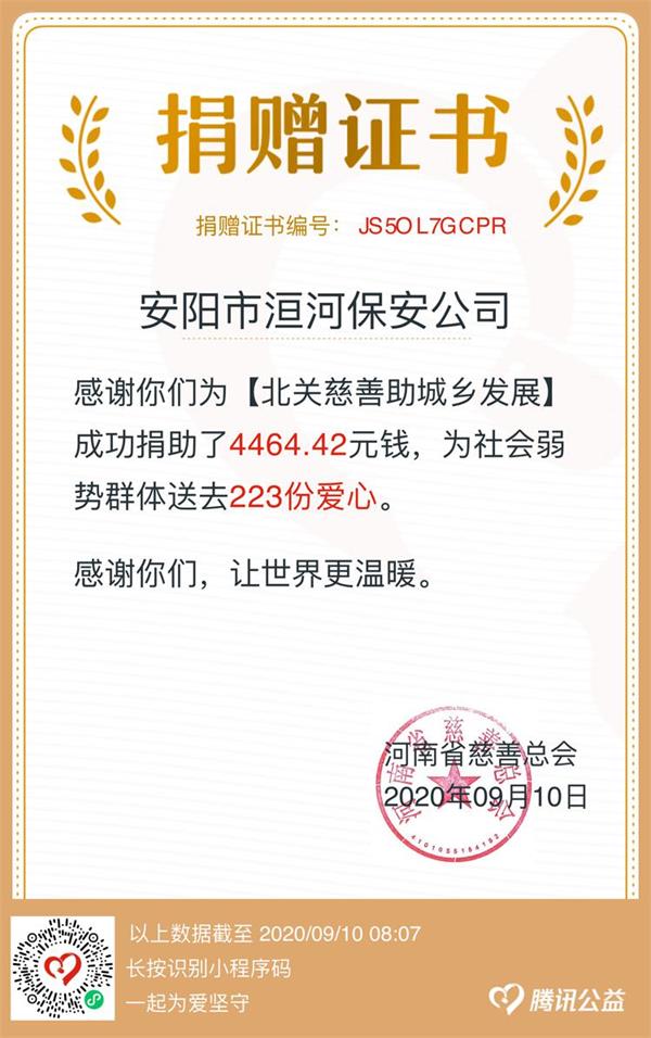 為弘揚(yáng)中華傳統(tǒng)美德,助力慈善事業(yè)發(fā)展,充分發(fā)揮互聯(lián)網(wǎng)在慈善活動中的重要作用,9月7日—9月9日,安陽市洹河保安公司組織開展“99公益日”慈善捐款活動,全體干部職工通過網(wǎng)絡(luò)愛心捐款共計4464.42元。