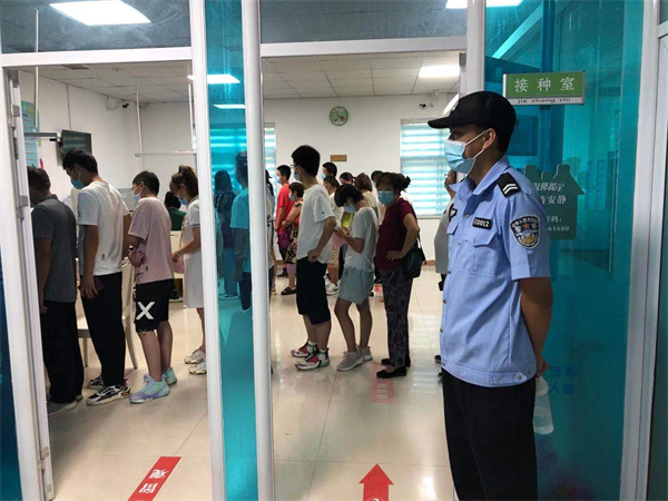特保巡防隊員緊密配合相關(guān)部門,現(xiàn)場維護(hù)秩序。接種現(xiàn)場分別設(shè)置等候區(qū)、登記室、接種室、留觀區(qū)、隔離室和處置室等區(qū)域。為防止疫苗接種現(xiàn)場人員集中涌入,造成人員聚集,執(zhí)勤隊員全程做好現(xiàn)場秩序維持、人員分流、指導(dǎo)疫苗接種群眾佩戴好口罩、有序排隊、填寫疫苗接種登記信息、入場,并及時勸導(dǎo)接種后人員有序撤離現(xiàn)場,接種現(xiàn)場整個過程有條不紊。