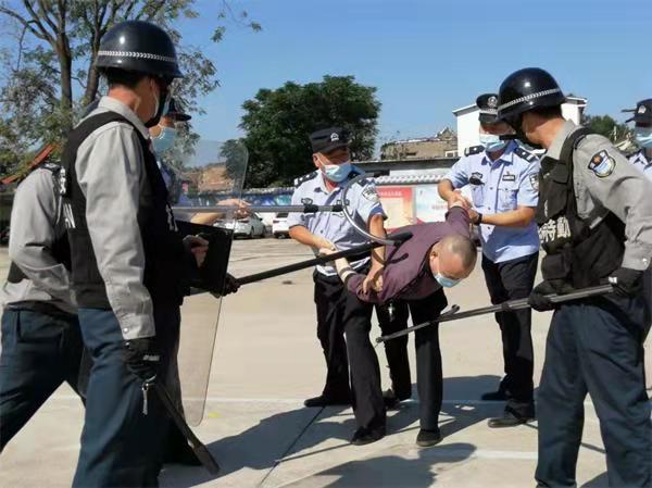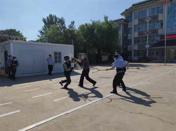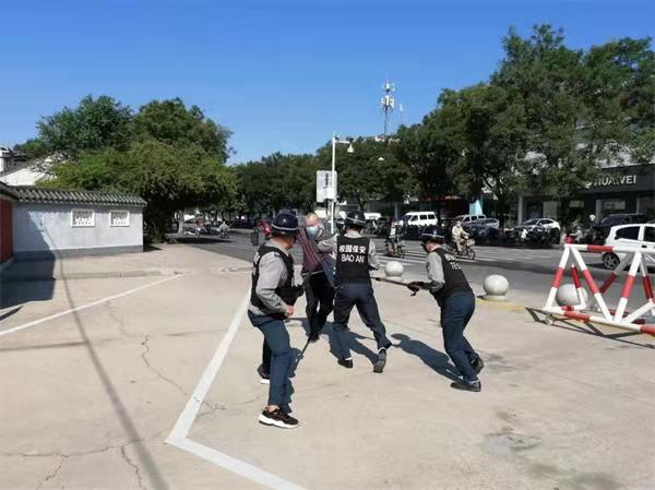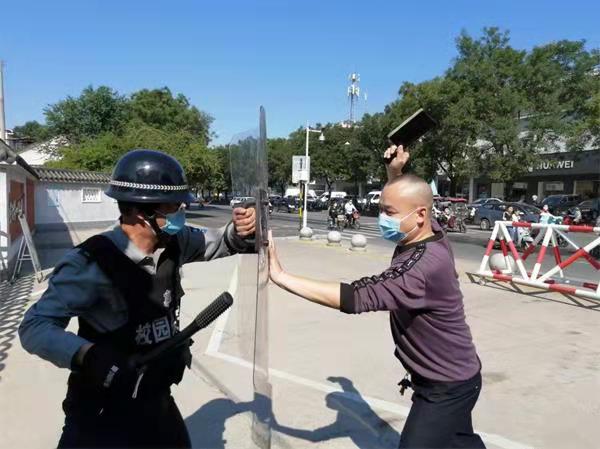 一名“恐暴”分子到學(xué)校門崗尋釁滋事,與門崗保安隊員發(fā)生沖突,暴徒手持菜刀闖進(jìn)校園。學(xué)校兩名保安手持鋼叉、盾牌與恐暴分子發(fā)生對峙,另一名保安按響了一健報警裝置,110指揮中心接到報警后,立即出動警力趕赴現(xiàn)場,學(xué)校保安和民警協(xié)同作戰(zhàn),成功將闖入校園的暴恐“歹徒”制服。整個演練過程緊湊、嚴(yán)肅逼真,受到了學(xué)校和派出所領(lǐng)導(dǎo)的表揚。