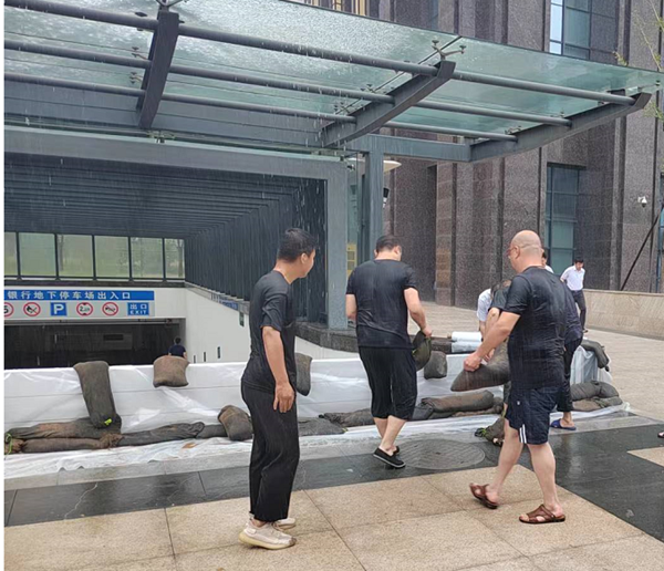 7月5日13點(diǎn)20分,天空突降暴雨,中原銀行駐地汛情緊急,為防止洪水倒灌,大隊(duì)隊(duì)長(zhǎng)李艷軍帶領(lǐng)隊(duì)員冒著瓢潑大雨為客戶單位筑起地下車庫出、入口防洪堤。大雨中,有的搬運(yùn)沙袋,有的拉起塑料布,大家一個(gè)心思就是確??蛻魡挝回?cái)產(chǎn)不受損失。隨著大雨退去,客戶財(cái)產(chǎn)安然無恙