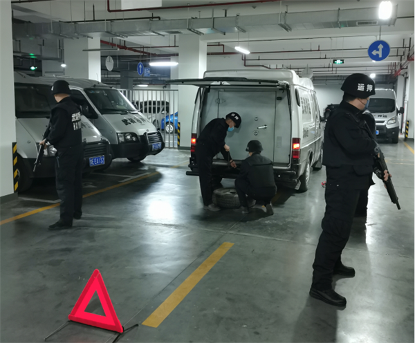 演練現(xiàn)場,一輛運鈔車在執(zhí)行押運勤務(wù)途中突發(fā)故障,車組人員沉著冷靜、反應迅速、措施得當,整個過程按照應急預案有序進行,達到預期效果。