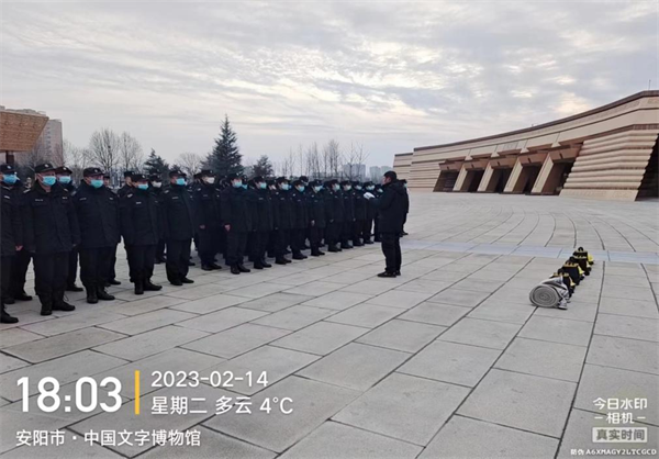 冬春交替,為有力遏制和預(yù)防火災(zāi)的發(fā)生,為進一步加強隊員們的安全防火意識,提升其在處理突發(fā)事件過程中的協(xié)調(diào)配合 能力,2月14日下午,特保大隊駐中國文字博物館中隊組織全體隊員開展了消防滅火演練。