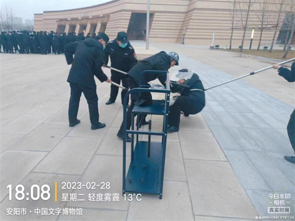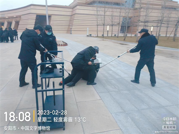 為增強(qiáng)特保隊(duì)員的反恐安全意識,提高對暴恐突發(fā)事件的應(yīng)變和處置能力,2月28日,特保大隊(duì)駐中國文字博物館中隊(duì)組織開展了反恐防暴應(yīng)急演練活動(dòng)。