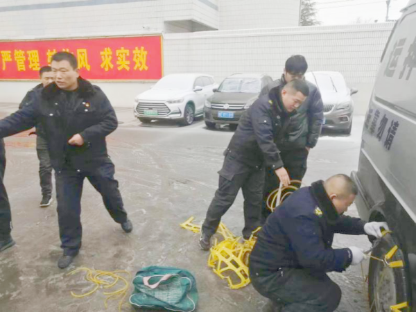 上午收車(chē)回來(lái)后,楊中朝立即督促各車(chē)組人員及時(shí)檢查防滑鏈,詢(xún)問(wèn)押運(yùn)途中的工作路況信息,并對(duì)車(chē)長(zhǎng)司機(jī)提出要求,一是要注意特殊路段的道路情況,所有車(chē)組至少配齊兩套防滑鏈,避免防滑鏈斷裂,偏遠(yuǎn)線路要攜帶三條防滑鏈;二是要減速慢行,不要強(qiáng)行超車(chē),勻速30-40公里行駛,車(chē)長(zhǎng)要密切配合司機(jī)觀察路況;三是要用對(duì)講機(jī)與大隊(duì)保持聯(lián)系,及時(shí)與客戶(hù)溝通,取消偏遠(yuǎn)網(wǎng)點(diǎn)的款箱運(yùn)送,調(diào)整下午點(diǎn)名時(shí)間,提前出車(chē),不惜一切代價(jià)堅(jiān)決打贏這次低溫冰雪天氣攻堅(jiān)戰(zhàn)。