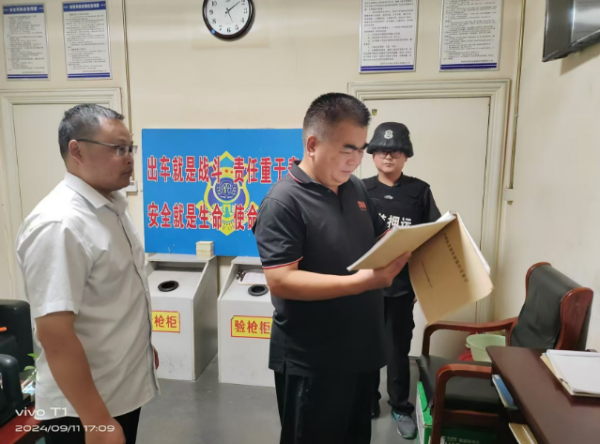 在槍彈庫,韋洪東仔細查看了槍支領用審批表和槍支彈藥日常使用登記臺賬等各項工作臺賬,并對日常槍支使用安全問題進行詳細詢問,特別強調要嚴格遵守公司制度,保證每天押運途中的運輸安全,確保大隊押運工作安全進行。