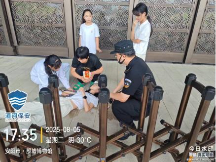 8月5日17時35分,殷墟博物館南門檢票區(qū),特保隊員李昊巡邏時,發(fā)現(xiàn)一名女游客突發(fā)暈厥。隨即上前穩(wěn)定游客身體姿態(tài),詢問同行的郭女士得知,暈倒者為其女兒,因高溫在等待檢票過程中突發(fā)身體不適繼而暈厥。