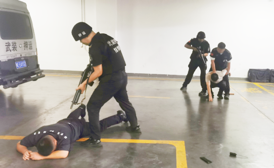 押運(yùn)車組隊(duì)員按照規(guī)定流程與銀行金庫(kù)工作人員進(jìn)行款箱交接,飾演歹徒的隊(duì)員從款車側(cè)翼沖出,欲劫取尚未完成交接的款箱。負(fù)責(zé)警戒的押運(yùn)員發(fā)現(xiàn)異常情況后迅速反應(yīng),在調(diào)款員的配合下,果斷出擊,制服歹徒。成功的保護(hù)了款箱和金庫(kù)工作人員的安全。