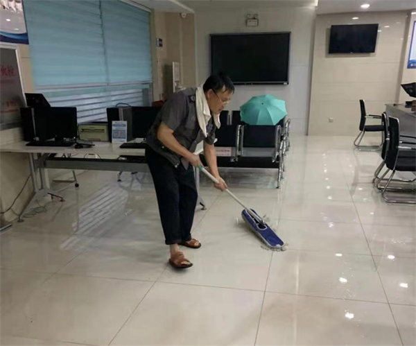 安陽市住房公積金隊(duì)員陳建國,凌晨發(fā)現(xiàn)大廳有雨水倒灌,及時(shí)用沙袋進(jìn)行加固封堵,清理大廳積水,衣服全部都濕透了,也毫無怨言。