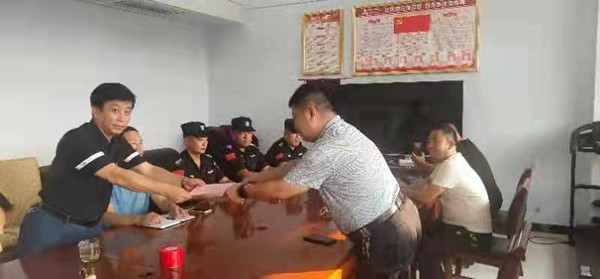 人民銀行保衛(wèi)科科長范子義支持會議。范科長首先代表行領導對在今年7月份安陽市出現(xiàn)強降暴雨,人行安陽市中心支行辦公大院出現(xiàn)嚴重積水,發(fā)行庫,辦公樓地下室面臨進水被淹的危險,安陽市洹河保安公司人防一大隊駐行保安班在中隊長潘戰(zhàn)營帶領下,面對險情,不懼風險,果敢應對,把自己的安危放到了一邊,體現(xiàn)了強烈的使命擔當精神,彰顯了洹河保安隊員訓練有素、作風過硬的素質(zhì)。使人民銀行單位財產(chǎn)避免了重大損失,為人行做出了特殊的貢獻,在銀行召開黨委會上,(行領導)多次提起這次抗洪救災中保安員出色表現(xiàn)和起到的功不可沒貢獻。并專門下發(fā)文件提出表彰。會議現(xiàn)場范科長向受到表彰隊員發(fā)放獎金以示鼓勵。副科長李飛向大隊領導贈送了表揚信。