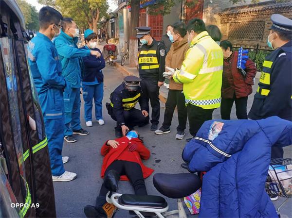 早上7點50分許,巡防隊員王軍清、梁子力,完成學(xué)校護校崗安保任務(wù)后,在返回單位途中,發(fā)現(xiàn)文峰北路與三道街交叉口車輛行駛極其緩慢,造成道路擁堵。王軍清立即下車查看,原來是一輛轎車與一輛電動車發(fā)生碰撞,導(dǎo)致電動車側(cè)翻倒地,一名約70歲的老人摔倒在地,見此情形,執(zhí)勤隊員連忙上前詢問查看,發(fā)現(xiàn)該老人表情痛苦,外觀有輕微傷。
