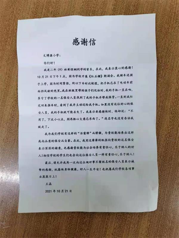 10 月21 日下午1點(diǎn),該校二年級(9)班黃煜嫻的家長王晶帶孩子來校參加《紅石榴》朗誦會(huì)。慌忙之中,下車時(shí)不慎把手機(jī)忘在了電動(dòng)車前面擋風(fēng)被的兜里,便匆匆進(jìn)了學(xué)校。因忙于幫助孩子們化妝,王晶根本想不起手機(jī)的事。后來她的手機(jī)一直在響,正在門口執(zhí)勤的保安員趙海利循聲找到手機(jī),便幫她保管了起來。待王晶忙完回來推車時(shí),趙海利主動(dòng)把手機(jī)交給了她。因?yàn)榇箝T外人行道過往的人很多,要不是這名保安給她把手機(jī)保管起來,肯定是找不回來了。王晶驚喜之余,表示要感謝他時(shí),趙海利善意提醒道:“不用了,下次小心點(diǎn),別再粗心大意忘東西了?!闭f完便忙他的去了。