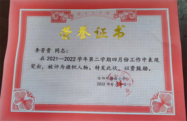 在疫情防控常態(tài)化背景下,校門管控是校園疫情防控的第一道防線,是疫情防控工作的重點部位,校園保安在校門守衛(wèi)持久戰(zhàn)中扮演著舉足輕重的角色。今年4月份以來,安陽市內(nèi)疫情多點散發(fā),為確保校園的安全穩(wěn)定,李芳貴堅守崗位,在校園內(nèi)開展全方位的消毒防疫和隱患排查工作,定期檢查水電消防,做到發(fā)現(xiàn)隱患及時處置,確保校園疫情防控及安全工作做實做好,承擔(dān)起守護校園疫情防控第一道防線的重大責(zé)任,在四月份總結(jié)評比中被安陽外國語小學(xué)評為旗幟人物。