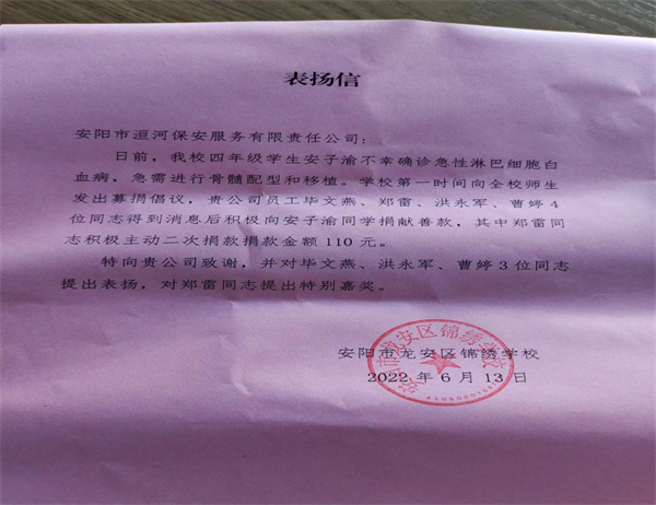 6月13日,錦繡學校四年級學生安子渝不幸確診急性淋巴細胞白血病,急需進行骨髓配型和移植。學校第一時間向全校師生發(fā)出募捐倡議,人防四大隊駐學校員工畢文燕、鄭雷、洪永軍、曹月婷 4位同志得到消息后積極向安子渝同學捐獻善款,其中鄭雷同志積極主動二次捐款110元。錦繡學校得知情況后提出對畢文燕、洪永軍、曹月婷進行表揚,對鄭雷特別嘉獎,向洹河公司發(fā)來表揚信。