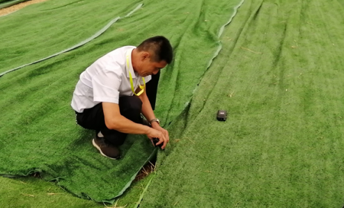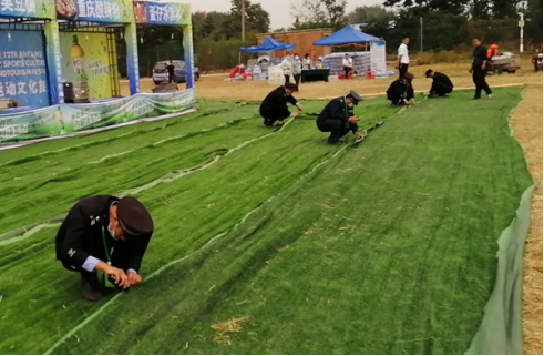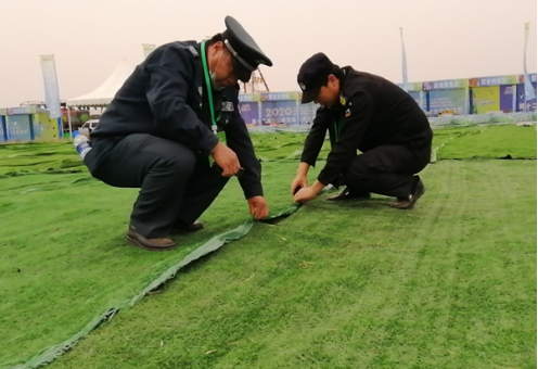 被抽調(diào)出的執(zhí)勤人員分工合作,有的負(fù)責(zé)鋪平草坪地毯,有的負(fù)責(zé)將地毯用訂書釘釘在一起,大家干得熱火朝天。經(jīng)過2個(gè)多小時(shí)奮戰(zhàn),13500平方米凌亂的草坪地毯再次整整齊齊鋪在了主會(huì)場??蛻艨吹胶?,直夸我們的保安員真能干。