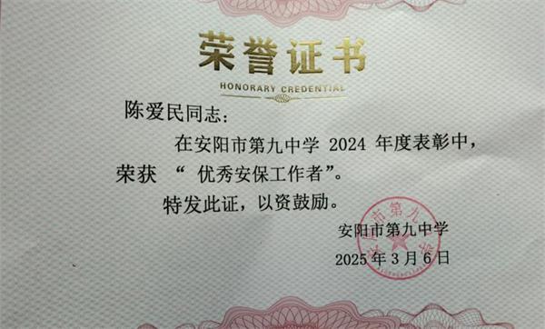 3月6日下午,安陽市第九中學(xué)舉行2024年度工作表彰大會,人防三大隊派駐該校保安員陳愛民獲得“優(yōu)秀安保工作者”榮譽稱號。