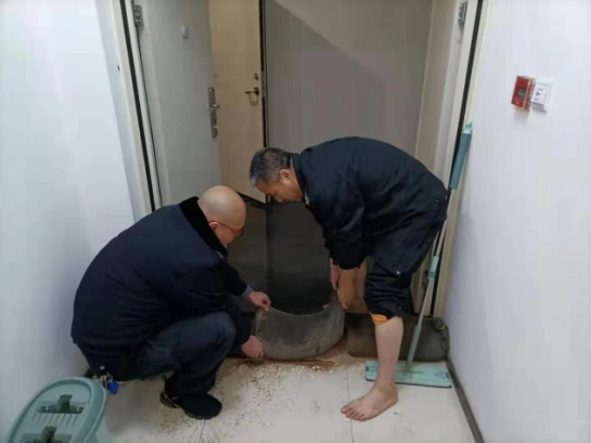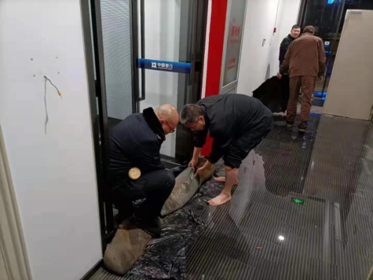 看到水還在通過破裂的管道不斷涌出,辦公室和走廊已經(jīng)有了積水,已經(jīng)危及到辦公用品的安全。值班隊員不顧寒冷,立即行動起來,與中原銀行物業(yè)人員投入搶險。隊員趙紅、王勇一方面把已經(jīng)有積水的辦公室中的物品搬運出來,另一方面迅速用沙袋擋在辦公室門口,阻止流水進入,并用掃把等工具清理積水;趙紅更是脫掉鞋,光著腳,泡在寒冷刺骨的水中,清理積水,減少損失。物業(yè)人員則從管道破裂處,接上臨時管道把水引向樓外。經(jīng)過一個小時的奮戰(zhàn),辦公室和樓道內(nèi)的積水終被清理完畢。