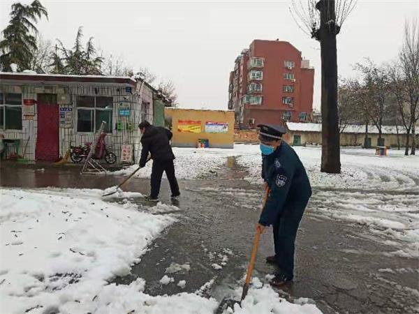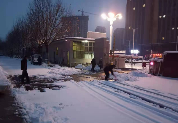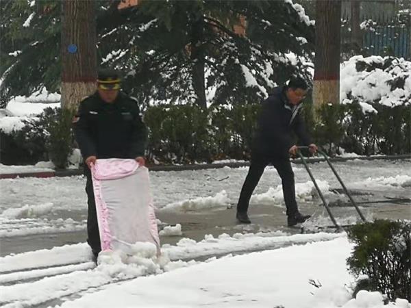 為盡快消除積雪給學(xué)校道路交通帶來的諸多不便,各個(gè)班組接班的隊(duì)員提前到崗,下班的隊(duì)員晚點(diǎn)下班,投入掃雪工作。雖然天氣有點(diǎn)冷,但是大家全然不顧,一個(gè)個(gè)爭先恐后,各個(gè)駐學(xué)校的保安揮動(dòng)著手中的鐵鍬、大掃帚,配合默契、干勁十足,齊心協(xié)力,鏟的鏟、推的推、掃的掃。經(jīng)過近一個(gè)小時(shí)的奮戰(zhàn),學(xué)校主要區(qū)域的雪已被清除干凈。