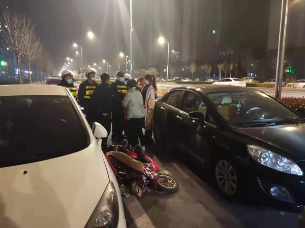 3月14號晚上8點40分左右,人防一大隊派駐高新區(qū)分局巡防隊徐強(qiáng)、郝文佺,閆志強(qiáng),孫守偉,宋立等5名隊員在轄區(qū)巡邏,行至開發(fā)區(qū)佳田未來城小區(qū)西門非機(jī)動車道看到一起交通事故。當(dāng)時,事故雙方情緒激動,在激烈爭吵,還有一名小孩受輕傷。