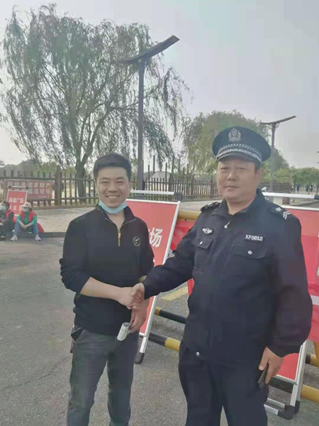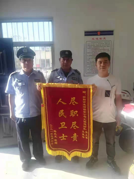 5月17日下午,安陽縣都里鄉(xiāng)好井村村民路鵬手持寫著“人民衛(wèi)士 盡職盡責(zé)”的錦旗趕到殷都區(qū)文廣新局文保巡防班,感謝巡防班班長(zhǎng)王俊峰和隊(duì)員張文喜無私幫助其找回錢包的行為。